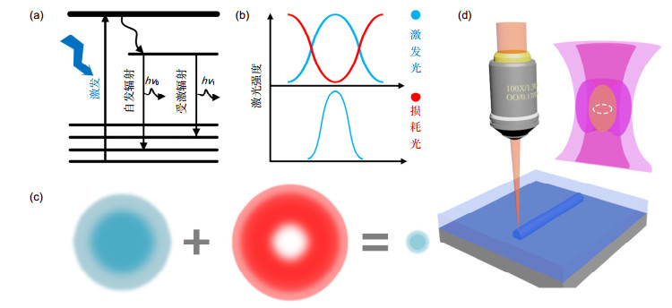 受激发射损耗荧光显微术的原理。(a)电子跃迁示意图;(b)激发光与损耗光在聚焦光斑中心处重合及有效光强分布;(c)焦平面光斑示意图;(d) SPIN激光纳米直写制造技术