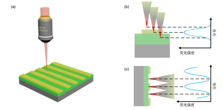 (a) 双光束超分辨扫描盘面;(b)荧光轴向定位;(c)荧光径向定位
