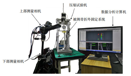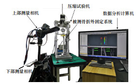 外固定器固定是治疗骨折时常见的固定方式之一,医生通常根据经验选择外固定的类型、安装位置及Schanz钉的数量[-],如图 1所示为胫骨骨折的外固定方式。当固定方案不合理时会造成外固定的稳定性差甚至导致Schanz钉断裂。在传统骨折治疗的生物力学研究中,常使用简化的骨模型或尸体骨通过万能力学试验机、位移传感器、粘贴应变片的方法对外固定的稳定性进行研究[-];简化的骨模型与某一具体病人的骨折情况存在差异,每根尸体骨之间的力学性能也存在差距,且足够数量、尺寸一致的新鲜尸体骨来源有限;测量过程中使用万能力学试验机无法测量单根Schanz钉的变形量、应变片和位移传感器采集到离散的点在反映变形的完整性方面有所不足。学者们为了使分析结果更接近患者的真实情况,利用逆向工程重构患者的骨骼进行数值模拟分析[],运用3D打印技术制作骨模型进行实验分析并制定了个性化的治疗方案[-]。刘豫鑫等[]采用三维全场变形测量的方法研究了锁定钢板工作长度的生物力学,但所用的简单骨模型与胫骨解剖形态存在差异,对植入物的稳定性结果产生影响。