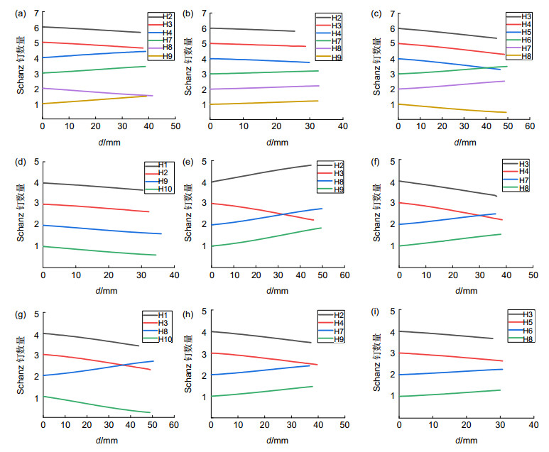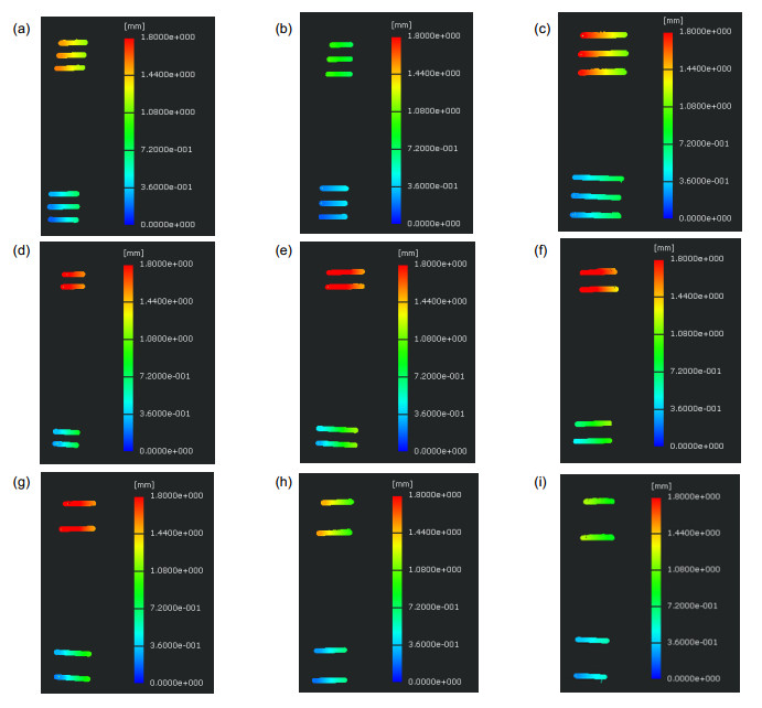 在正交试验不同因素水平的组合下,利用三维全场变形测量系统得到Schanz钉的三维点坐标,通过创建截线的方式可输出Schanz钉上某一条线的三维信息。Schanz钉变形量与胫骨到外固定距离d的关系如图 5所示,图 5(a)~5(i)分别对应试验1~9。总体上来说,外固定器上下两端Schanz钉的变形量相差较小。当Schanz钉数量相同时胫骨到外固定器的距离越小,Schanz钉的变形量越小;当胫骨到外固定器的距离一定时,随着Schanz钉数量减少,外固定器上每根Schanz钉的变形量增大。不同的方案Schanz钉向上或向下变形的趋势不同。