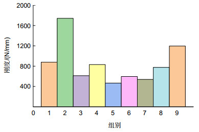各试验组Schanz钉的变形量见表 3。对各试验组的刚度进行比较可以看出A1B2C2的刚度最好,见图 6。外固定器在加载方向上的刚度由公式KF=F/X导出,F表示施加在胫骨平台上的外力,X表示Schanz钉的变形量。